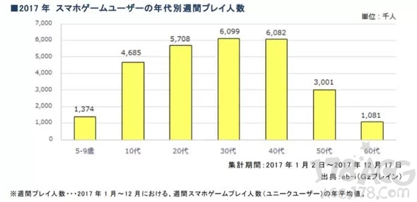 结论显示,在日本,2017年玩手游最多的年龄段是三十几岁的玩家,紧追其后的是四十几岁的玩家。