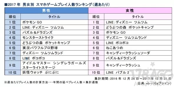 另外这篇报道还统计了男女性玩家间的不同游戏倾向,可以看出男性玩家主要玩的游戏第一位是「pokemon go」,第二名是「LINE:迪士尼消消看」以及「智龙迷城」,在排名的前十位游戏中,涉及到二次元偶像氪金的手游只有「偶像大师灰姑娘」,女性玩家的手游排名前三是「LINE:迪士尼消消看」、「动物之森口袋露营」和「pokemon go」,另外放置类治愈系手游「猫咪庭院」也在列。