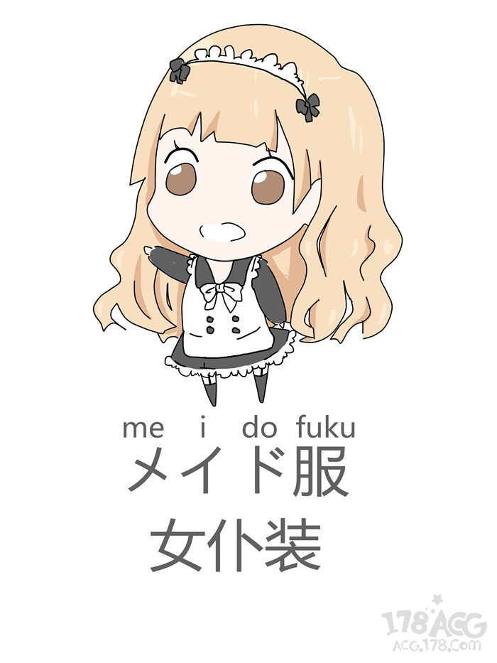 女仆装应该算是宅们都很熟知的打扮了,除了今年大热门的蕾姆以外,动漫中还有各式各样的经典女仆角色,这里就不一一列举了。メイド就是女仆,也就是我们常说的妹抖。顺带一提,メイド喫茶、メイドカフェ都是指的女仆咖啡厅哦~