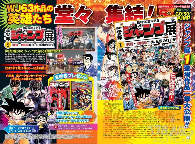「创刊50周年纪念 周刊少年JUMP展VOL.1」7月18日-10月15日,在东京森林艺术中心画廊举行。2018年春季又将开展第2弹「创刊50周年纪念 周刊少年JUMP展VOL.2 1990年代,发行量653万册的冲击」,2018年夏季开展「创刊50周年纪念 周刊少年JUMP展VOL.3 2000年代-,进化的最强杂志的今天」。
