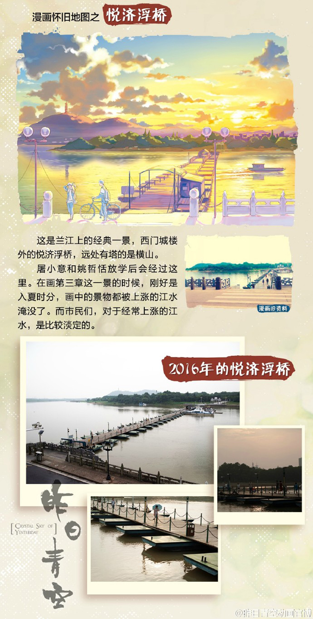 动画场景有参考当地的悦济浮桥,远处的横山上有一座塔。