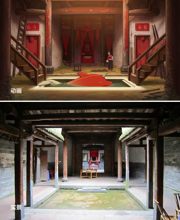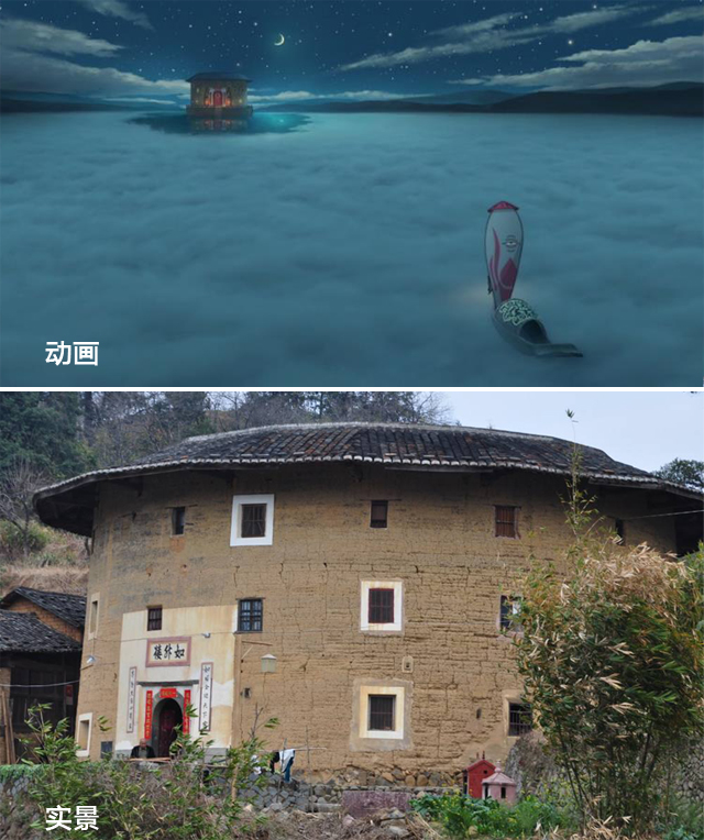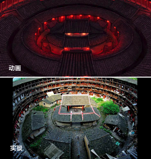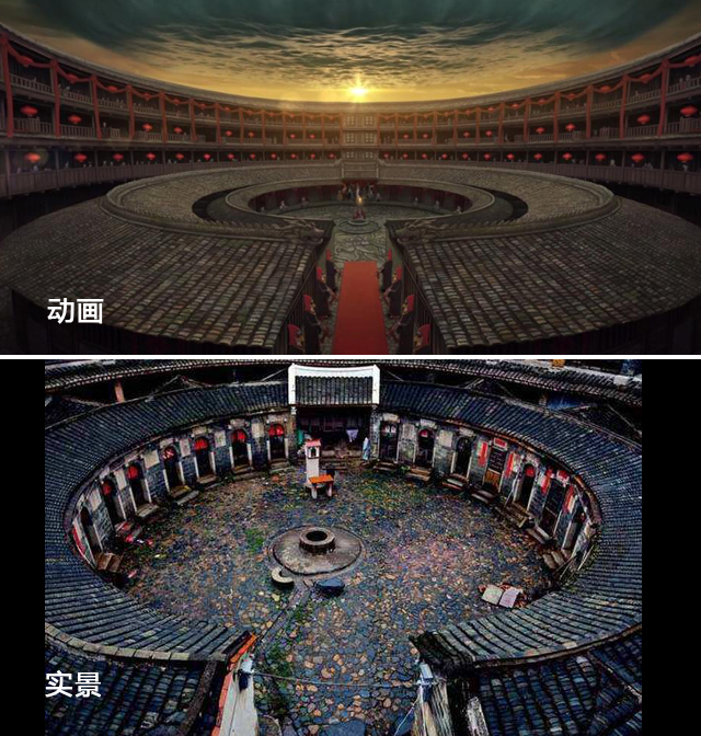 无论是在海报、预告还是多年前的那部短片动画里,我们都能看见这样一座环形建筑,其实这就是取材的福建土楼,也叫作客家土楼,在壮观之外还透露着一种复古的美感,民族气息非常重,让人叹为观止。